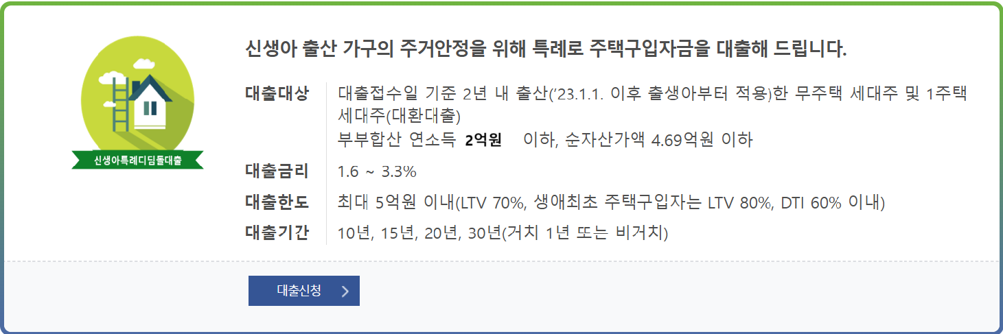 - 대출 접수일 기준 2년 이내 출산 : 2023년 1월 1일 이후 출생한 아기.