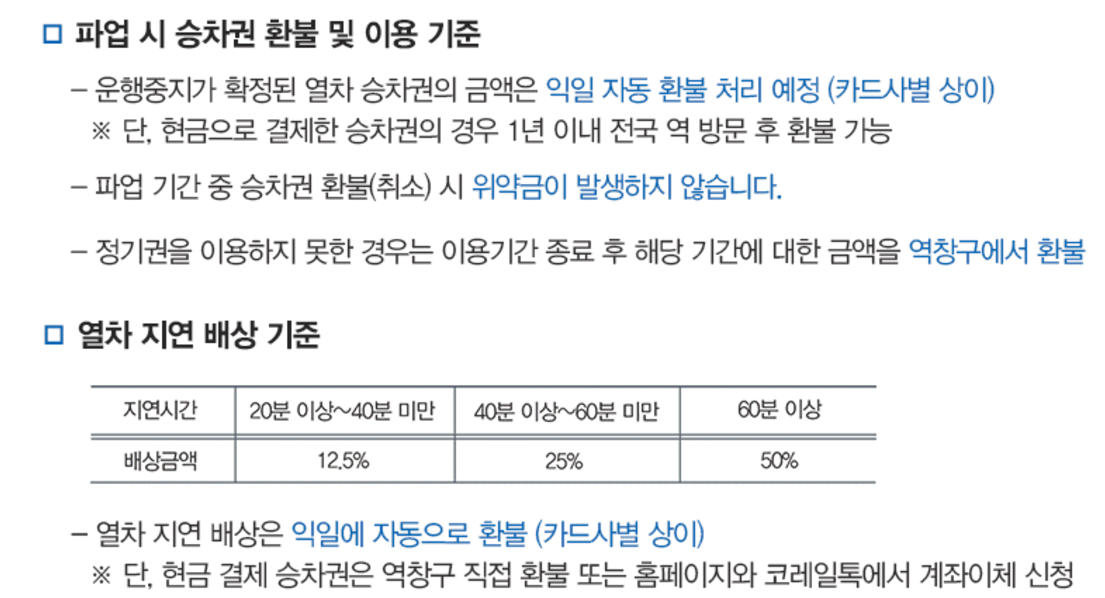 - 입석 기차표 : 파업으로 인해 운행이 중지된 경우, 전액 환불이 가능합니다.
